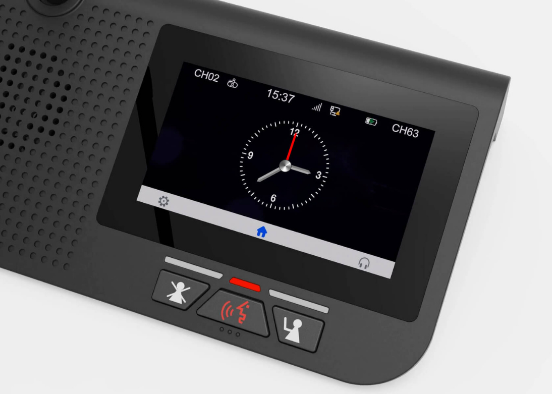 Unlike conventional systems, this solution introduces a visual and interactive meeting experience through its integrated touchscreen interface. Participants and moderators can view agendas, manage discussions, and access real-time information directly from the device, making meetings more organized and engaging.