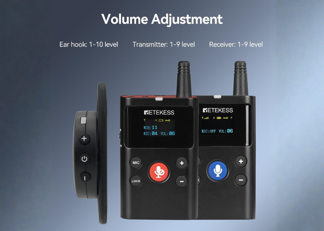 Each unit features a compact tabletop design with an intuitive touch interface and OLED display, allowing users to easily control microphone functions, monitor system status, and access interpretation channels.