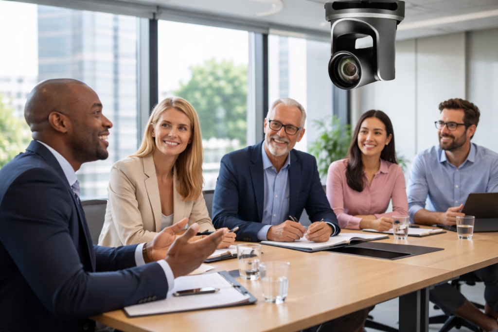 A Smart Auto-Tracking Camera is an advanced camera system that automatically follows a speaker or moving subject without manual operation.